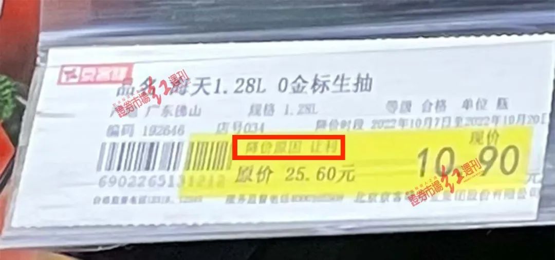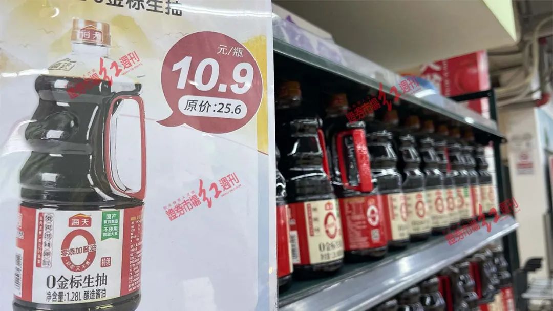 10月10日,《红周刊》走访位于三里屯的一家京客隆超市,在入门后就看到了醒目的“海天0金标生抽,原价25.6元/瓶,现价10.9元/瓶。”的促销广告。