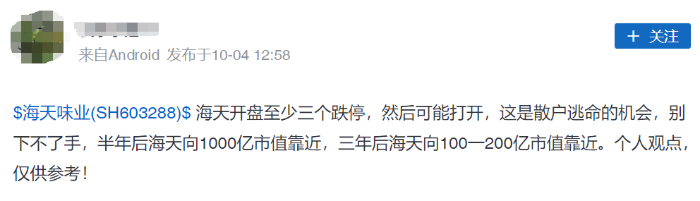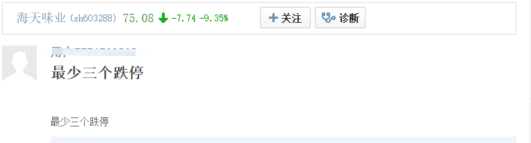 对于海天的大跌,市场多个互动平台早有预期,多位投资者更是预测10月10日开盘后就是“至少三个跌停”。