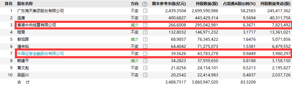 如从海天味业的前十大流通股东来看,外资与国家队均有持仓。其中,香港中央结算有限公司(陆股通)今年二季度末共持仓市值达266.60亿元,为公司第三大流通股东;国家队——证金公司持仓市值达39.56亿元,为公司第七大流通股东(见附表)。相较于一季度末,两者的持股数量整体发生变化不大。