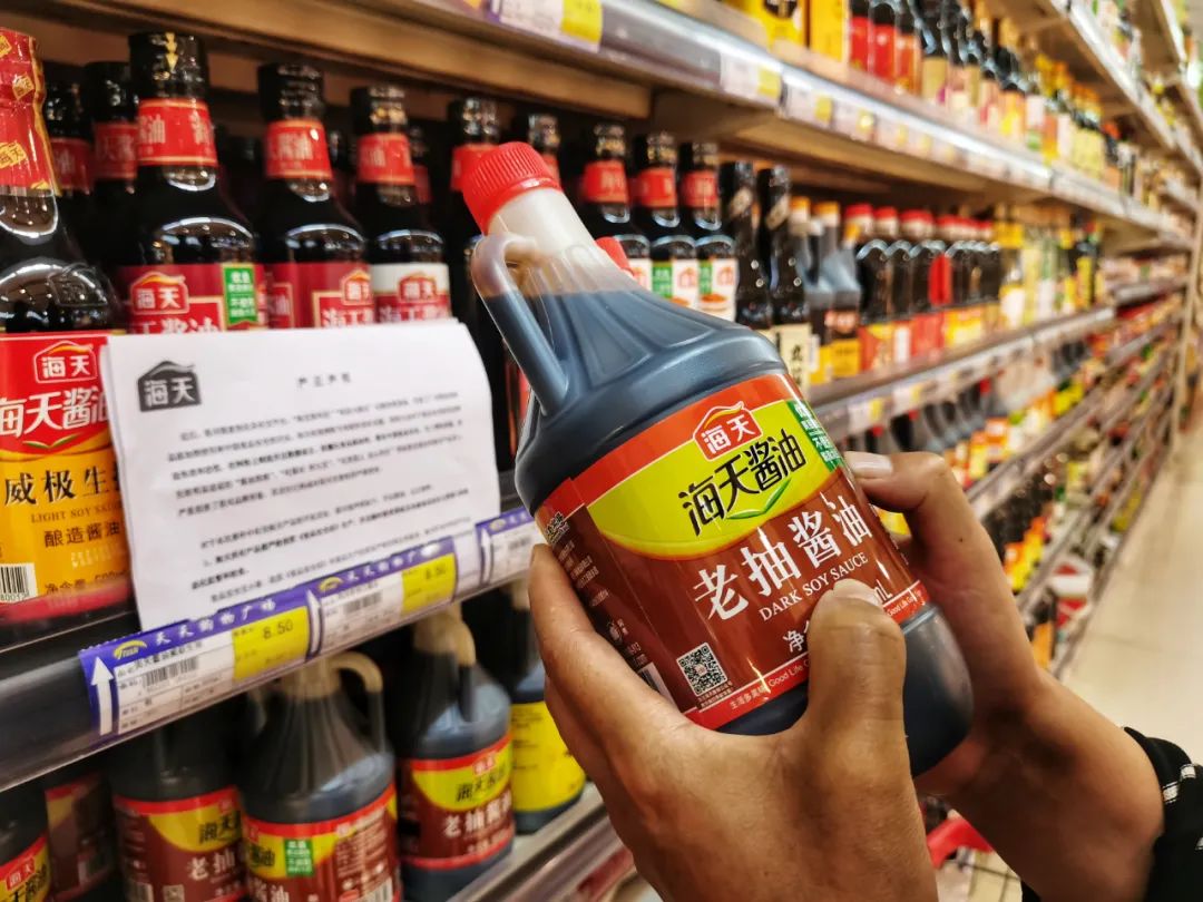 2022年10月5日,云南保山,在昌宁县的一个大型商超里,调味品专柜上张贴着海天味业的严正声明,市民如往常一样在选购海天酱油等调味品。(图|视觉中国)