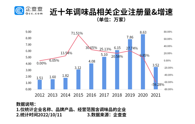 数据显示,我国现存调味品相关企业40.27万家。2022年上半年,我国新增调味品相关企业8532家,同比减少59.61%。2017年,我国新增调味品相关企业5.10万家,同比增长25.13%。2018年新增6.15万家,同比增长20.58%。2019年我国新增调味品相关企业7.86万家,同比增长27.74%。2020年新增8.63万家,同比增长9.85%。2021年新增3.52万家,同比减少59.28%。