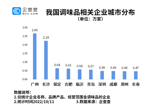 数据显示,从城市分布来看,广州以2.66万家调味品相关企业排名第一。长沙、保定分别有2.24万家、0.64万家,位居前三。此后依次为合肥、临沂、青岛等城市。
