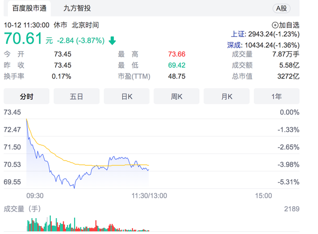 自9月30日首度回应“双标”争议以来,海天味业市值已下跌超1成,蒸发超400亿元。风波持续近半月,热度依然不减。受此影响,10月10日也即国庆节后的第一个交易日,海天味业低开7.99%,收报75.08元/股,日内跌幅达9.35%,截至收盘总市值约为3479亿元。截至10月12日11:30,最低值69.42元/股。
