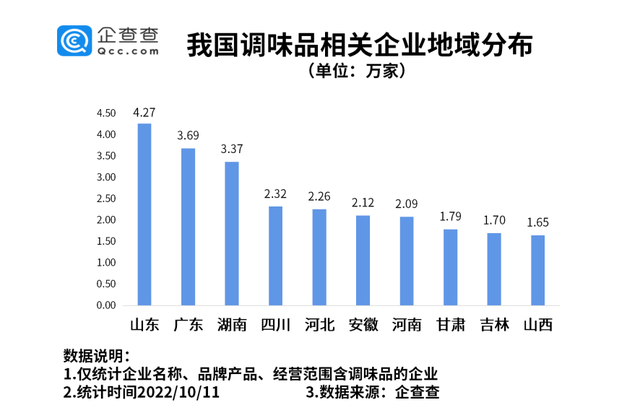 数据显示,从区域分布来看,山东以4.27万家调味品相关企业排名第一。广东、湖南分别有3.69万家、3.37万家调味品相关企业,位居前三。此后依次为四川、河北、安徽等地。
