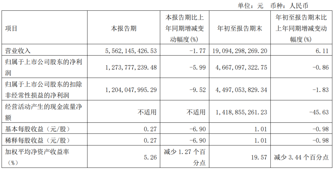 前三季度,公司实现营业收入190.94亿元,同比增长6.11%;实现归属于上市公司股东的净利润46.67亿元,同比减少0.86%;实现归属于上市公司股东的扣除非经常性损益的净利润44.97亿元,同比减少1.83%。