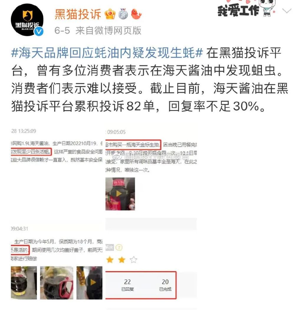 根据黑猫投诉[投诉入口]平台6月5日发布的信息,曾有多位消费者表示在海天酱油中发现蛆虫。消费者们表示难以接受。截至目前,海天酱油在黑猫投诉平台累积投诉82单,回复率不足30%。