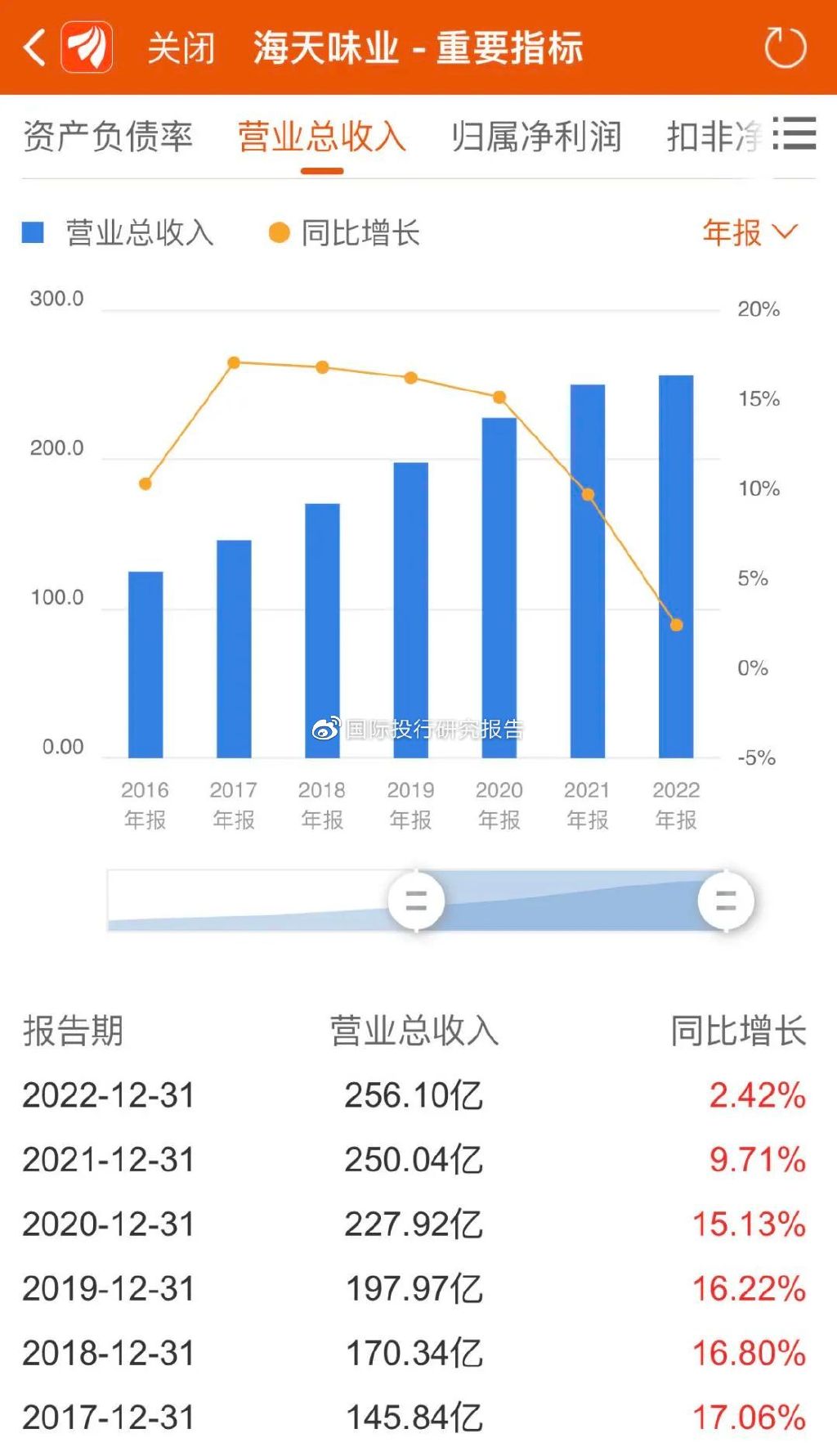 在前不久举行的业绩说明会上,海天对2023年的业绩定下了营业收入281.7亿元、净利润68.2亿元的经营目标,较2022年营收增加25.6亿元、净利润增加6.2亿元,增幅皆为10%。面对当下不断放缓的业绩增长情况,这一目标能否实现或许成为海天今年最大的考验。