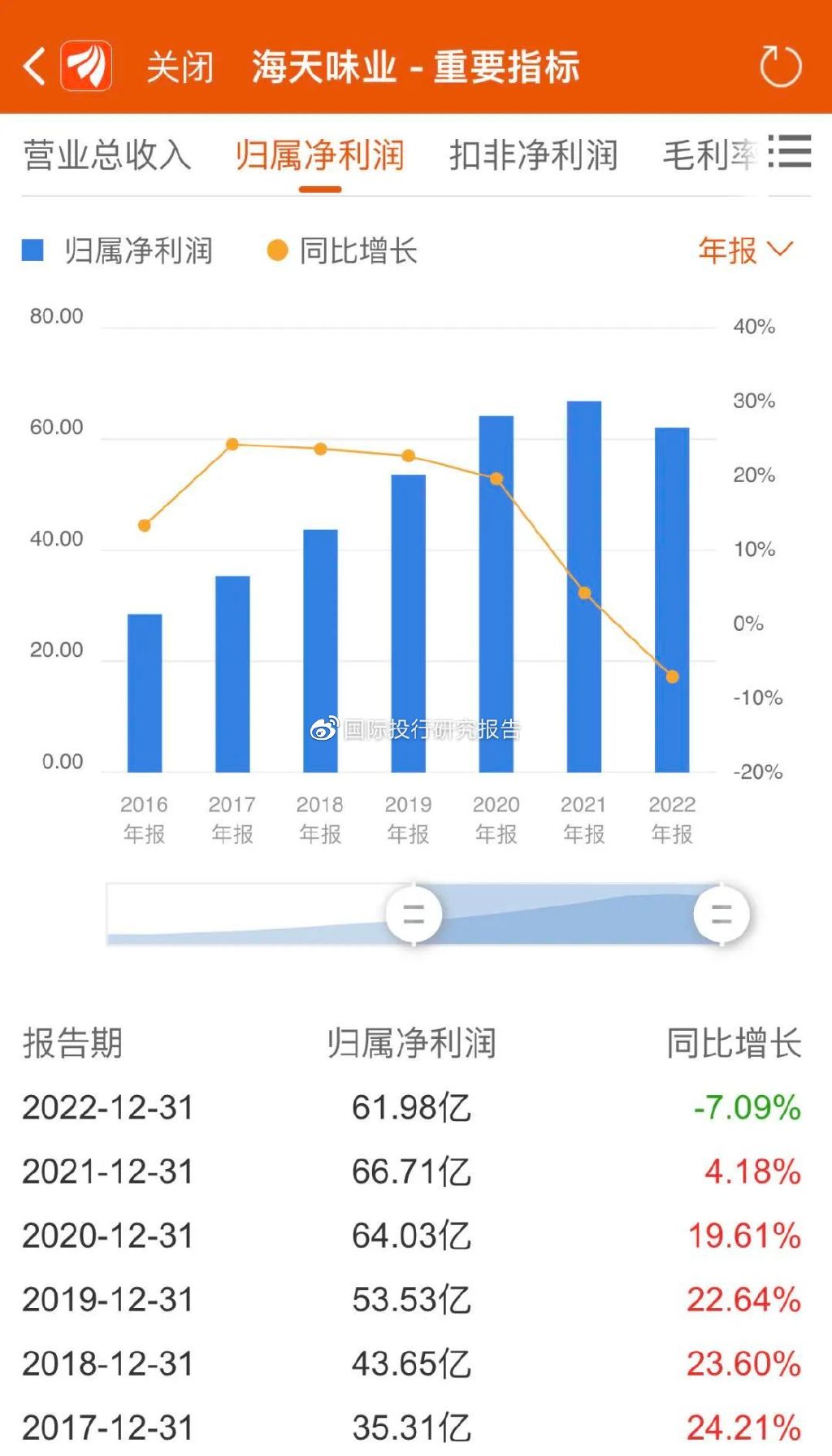 整体来看,海天近五年来业绩增速不断放缓。2018-2022年,海天味业的营收增速分别为16.8%、16.22%、15.13%、9.71%、2.42%;净利润增速分别为23.6%、22.64%、19.61%、4.18%、-7.09%。