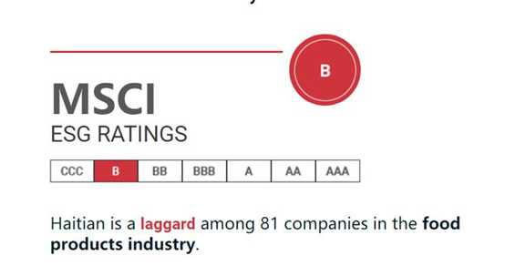 全球最大指数公司之一MSCI Inc.(明晟公司),2019年和2020年,给出海天味业的ESG评级为CCC级,即最低等级,经过企业调整和完善后,近三年均保持在B级水平,但也属于ESG等级中的倒数第二低的等级。