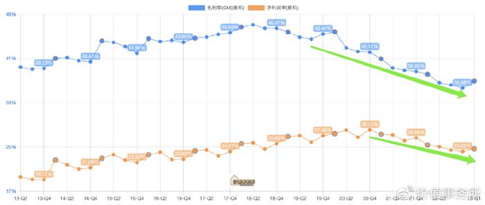 到2023 年 Q1,公司的业绩也依然没有好转,营收 69.81 亿元,同比-3.17%,归母净利润 17.16 亿元,同比-6.2%。