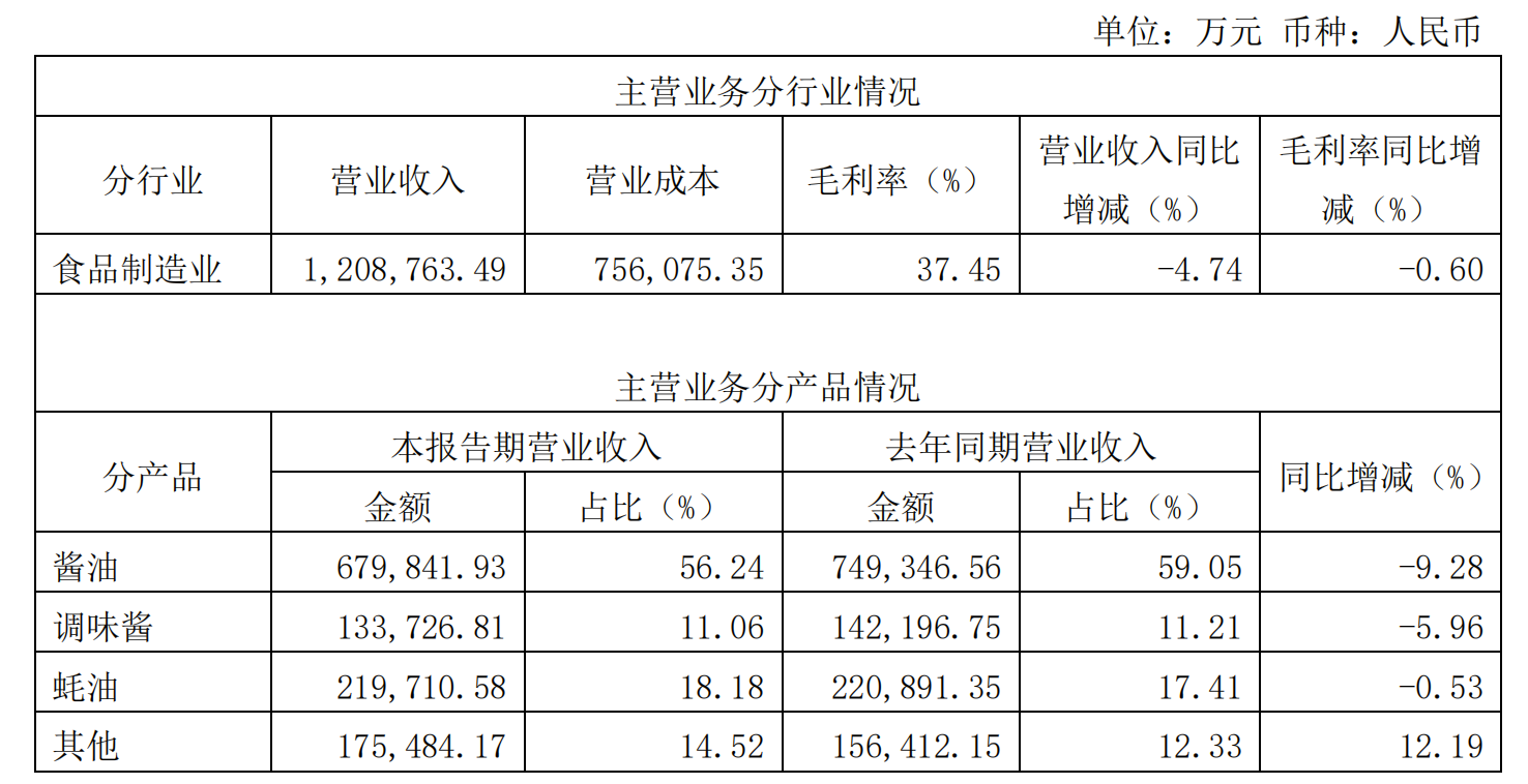 聚焦上半年具体业务业绩情况,分行业来看,上半年海天味业食品制造业营收120.88亿元,同比下降4.74%,毛利率为37.45%,同比下滑0.6%。