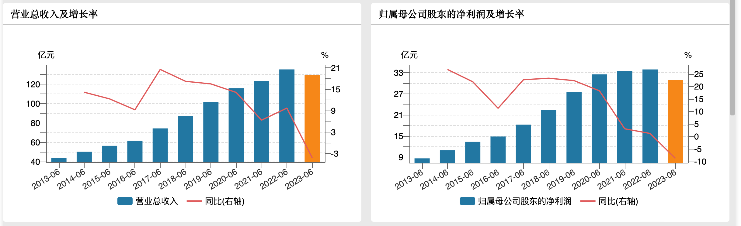 据wind数据显示,海天味业上市后,今年上半年营收和净利润为首次下滑。值得注意的是,此前海天味业业绩增速也已呈多年下滑态势。上半年净利润增速自2018年同期的23.3%持续下滑至2022年的1.21%。上半年营收增速从2017年的20.57%不断下滑至2021年的6.36%,2022年增速微微提升至9.73%。而2023年则直接营收、净利双降。