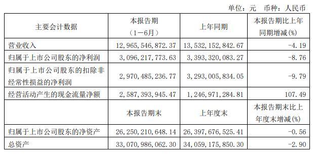 上半年,海天味业实现营收129.66亿元,同比下滑4.19%;实现净利润30.96亿元,同比下滑8.76%;实现扣非后净利润29.70亿元,同比下滑9.79%。