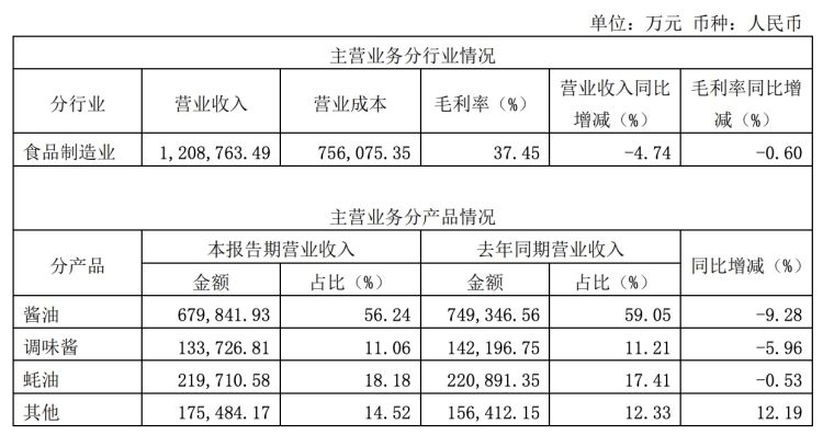 分产品来看,公司酱油收入67.98亿元,同比下降9.28%,占比56.24%,占比同比下降近3个百分点;调味酱收入13.37亿元,同比下降5.96%,占比11.06%,占比同比几乎持平;蚝油收入21.97亿元,同比下降0.53%,占比18.18%,占比同比微微下滑;其他收入17.55亿元,同比增长12.19%,占比14.52%,同比增超2个百分点。