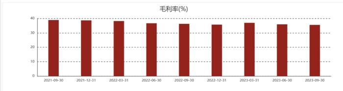 2022年第二季度至2023年第三季度毛利率分别为36.63%、36.24%、35.68%、36.93%、35.91%、35.49%,分别同比下降-2.68、-2.63、-2.98、-1.24、-0.72、-0.75个百分点。