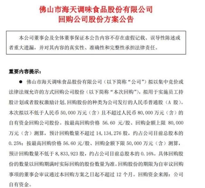 10月16日晚间,海天味业董事长庞康曾提议,出资不低于5亿元、不超过8亿元,通过二级市场回购公司股份,所回购的股份用于未来股权激励。回购股份可以用于多种目的,如员工持股计划、股权激励、市值管理、盈利补偿、稳定股价、投资者预期管理以及市场信心提振等。