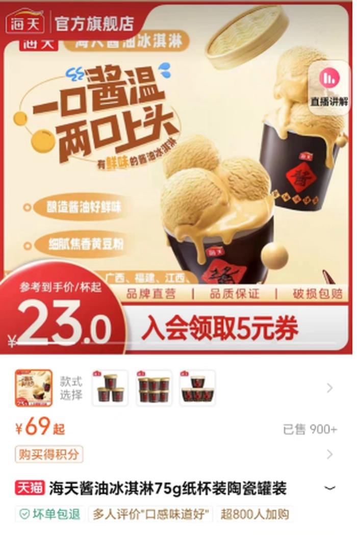 2023年夏天,海天味业继苹果醋冰淇淋后再为调味品冰淇淋增加一员猛将——酱油冰淇淋。品牌官方对于海天推出酱油冰淇淋的解释是:公司以酱油冰淇淋为引,与消费者近距离沟通互动,通过分享匠心酿酱油的故事、展示品牌新形象、传播海天品牌文化,赢得年轻消费者认可的同时,对外展示了海天作为300年老字号品牌的“年轻化”形象。据了解,该产品在广州、长沙、上海、成都四大高温城市设置快闪店免费派送新品同时,还上线了官方商城小程序、淘宝旗舰店。