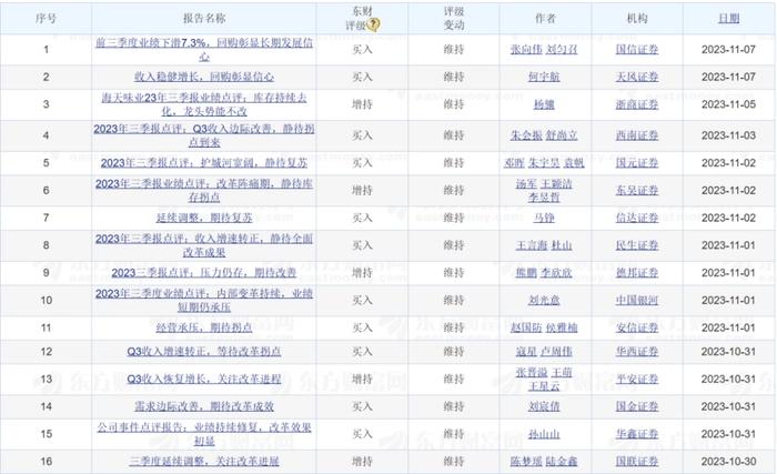 行业分析师吕朝伟表示:“海天味业作为中华老字号企业,在经济形式动荡的大环境下正在积极的迎接市场机遇与挑战,虽存在转型升级‘阵痛’,但公司多年的口碑和知名度不会被抹杀。”三季报后,国信证券、天风证券、浙商证券等16家机构也分别给予海天味业买入、增持评级。