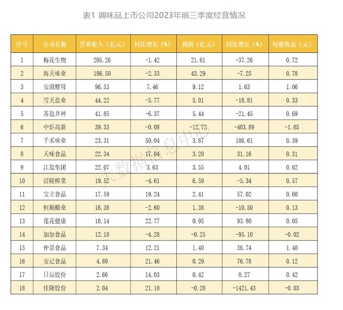 今年前三季度,海天味业实现营收186.5亿元,同比下降2.33%。据中国调味品协会大数据信息中心的数据,2023年调味品行业18家上市公司2023年前三季度营业收入合计为780.35亿元,净利润合计95.28亿元。其中,营业收入正增长的有10家,占18家上市公司的55.56%;净利润正增长的有9家,占18家上市公司的50%。海天味业从去年同期的经营情况第一名滑落至今年的第二名。