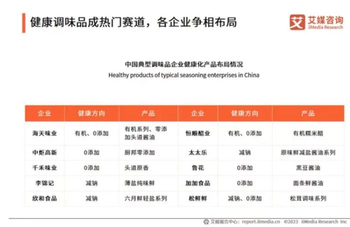 艾媒咨询调研数据显示,消费者对饮食的需求逐渐转变为安全和健康,这成为调味品企业产品研发的主要方向,海天味业、中炬高新、千禾味业、恒顺醋业、鲁花、加加食品均推出有机或0添加产品参与市场竞争,随着布局健康调味品的企业增多,同质化趋势也越发明显,竞争加剧,在健康调味品赛道形成差异化竞争优势将成为企业制胜点。