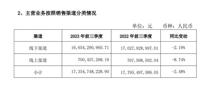 但海天味业营业收入高度依赖线下渠道,财报数据显示,2023年前三季度,海天味业线下渠道实现营业收入166.54亿元,占营业收入比重为95.96%。线上线下渠道营业收入均呈下滑态势,同比变动率分别为-2.19%、-8.74%。