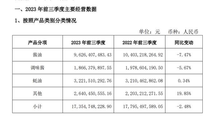 在业绩中报中,海天味业论述道:“公司仍然面临着餐饮逐步恢复尚需时间、行业内企业竞争愈发激烈、部分原材料价格依然处于高位的经营环境。面对复杂严峻的市场环境,公司始终坚定发展信心,加速变革,推动公司业务正常发展。”从2023年第三季度单季度数据情况来看,海天味业实现营收56.846亿元,同比增长2.2%,营收整体下滑幅度收窄,公司确实正在按照中报所述,对业务积极调整。