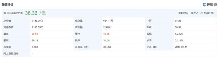 据BT财经数据通查询,海天味业财报对股价也产生一定影响,在2021年2月海天味业市值曾逼近7000亿元,估值120倍,还曾因市值赶超万科、中石化,估值水平超伊利股份、贵州茅台等知名公司而上热搜。天眼查数据显示,截止2023年11月12日收盘,海天味业收盘价为38.36元,涨跌幅为-0.39%,总市值2133.05亿元,较市值高点下跌近5000亿元。