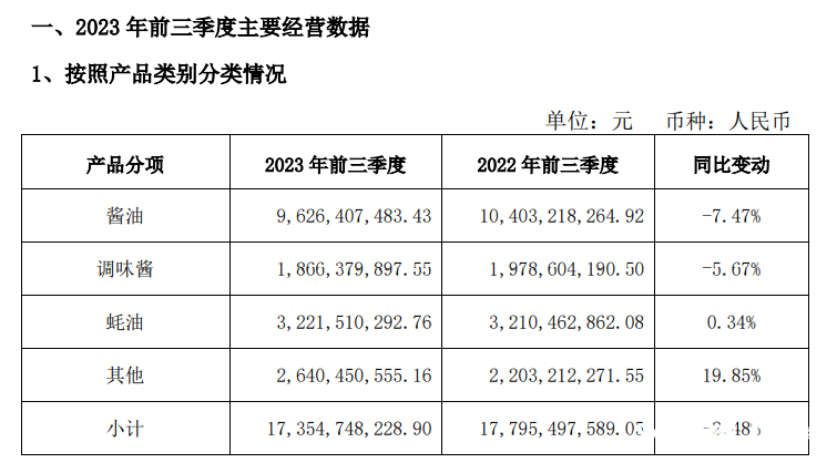 酱油营收96.26亿元,同比下滑7.47%;
