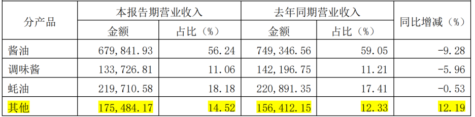 调味酱营收18.66亿元,同比下滑5.67%;