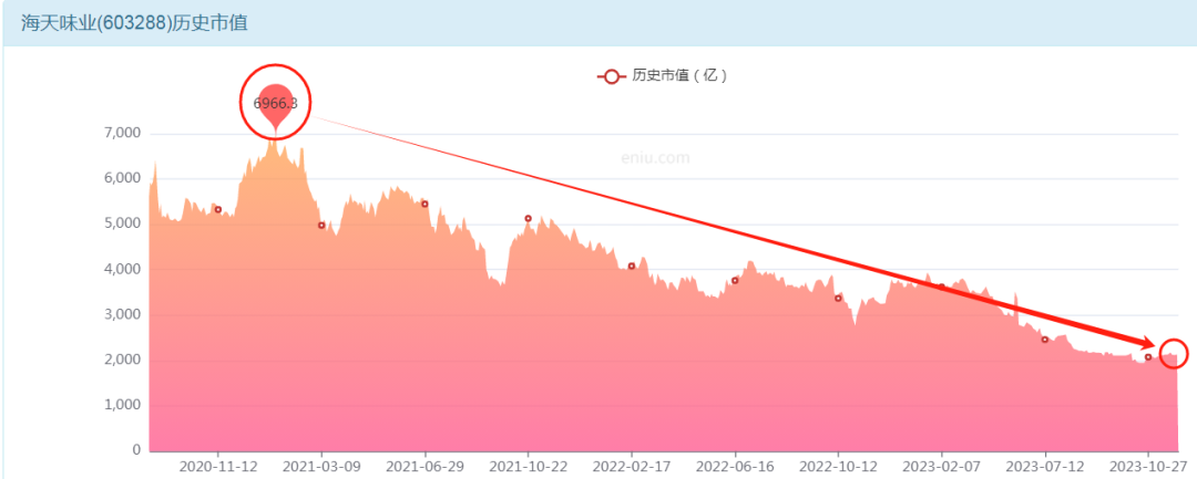 但时至今日,这个神话已然熄火。截至2023年11月22日收盘,海天味业的总市值只剩下2113亿,相比高点跌去近70%。