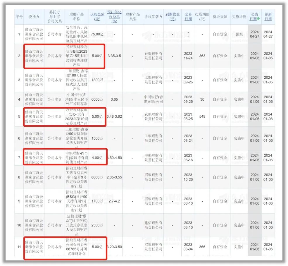 但海天手握200亿以上的现金没处可花,只好用于购买各种“理财产品”。2023年完成理财(包含实施中)累计47次,累计理财金额73.34亿元。2024年完成理财(包含实施中)累计12次,累计理财金额21.35亿元,其中购买兴银理财、农银理财、招银理财、中银理财等产品的金额分别为5.00亿元、5.00亿元、5.00亿元、4.00亿元。