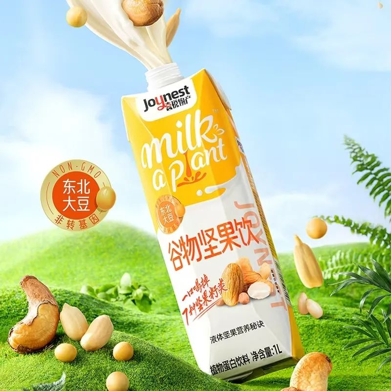而谷物坚果饮则称含糖量≤5g/100ml,采用杏仁、腰果、大豆、巴旦木、葵花籽、芝麻和花生的混合搭配,每盒坚果及籽类含量45g,并且益生菌(动物双歧杆菌亚种)添加量≥3X10^7CFU/L。