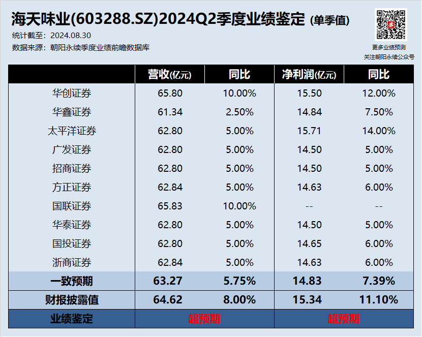 结合以上数据,海天味业2024年二季度营收及净利润均超预期。