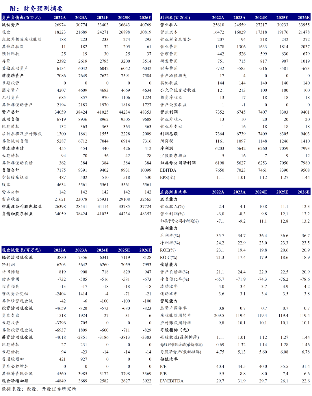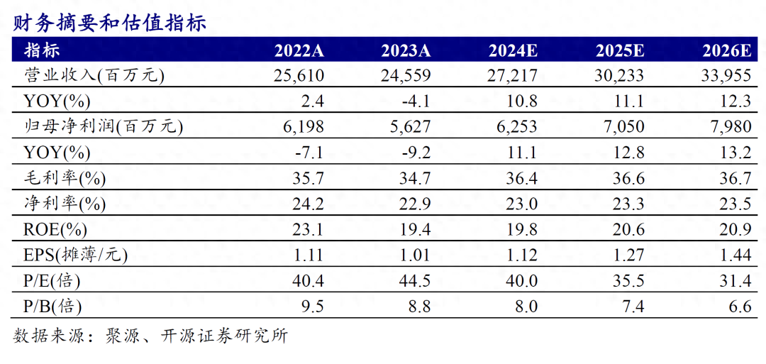 公司披露2024年三季报。2024Q1-Q3公司营收/归母净利润分别为203.99/48.15亿元(同比+9.38%/+11.23%);其中2024Q3营收/归母净利润分别为62.43/13.62亿元(同比+9.83%/+10.50%)。收入利润符合预期。我们维持2024-2026年盈利预测,预测2024-2026年归母净利润分别为62.5/70.5/79.8亿元,同比+11.1%/+12.8%/+13.2%,当前股价对应PE40.0/35.5/31.4倍。维持“买入”评级。