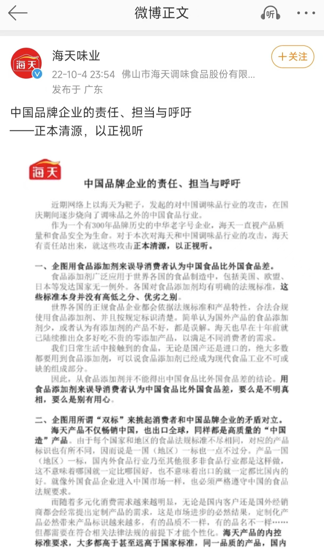 2022年10月初,海天旗下酱油产品陷入配料表“双标门”,这起事件虽然是因为我国和日本对食品配料标注标准有所不同引起,我国标准甚至高于日本。虽然后续海天和中国调味品协会先后发表声明澄清,不过还是影响了海天味业股价。