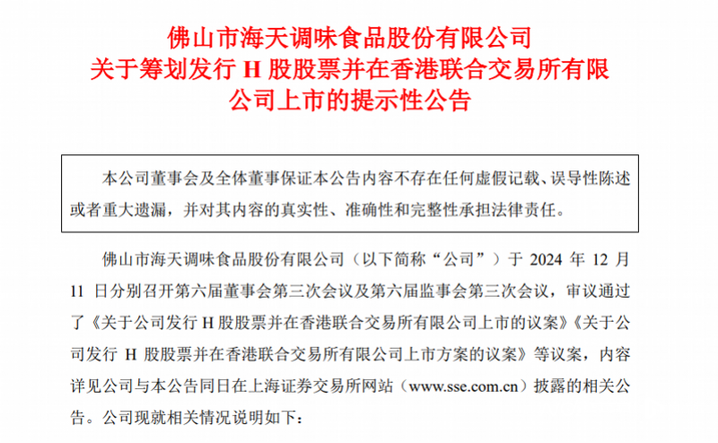 2024年12月11日,海天味业发布公告,为进一步推进全球化战略,提升国际品牌形象和综合竞争力,公司拟发行H股股票并在香港联交所主板挂牌上市。