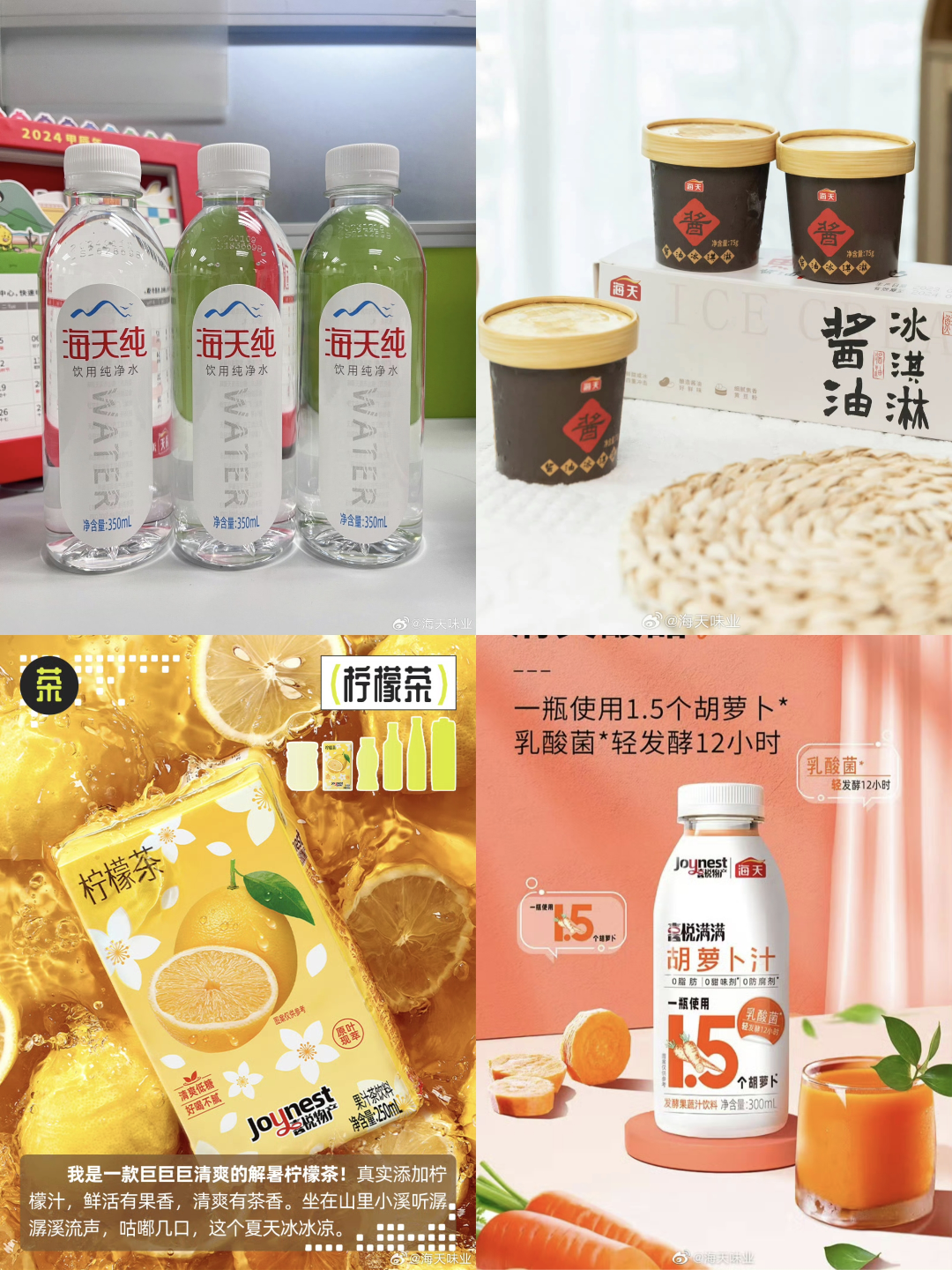 早在2020年,海天就推出了食用油和果蔬饮料;2022年,海天推出胡萝卜汁和青柠汁;2023年,海天又推出了酱油冰淇淋;2024年上半年,海天又推出了柠檬茶、植物饮料和瓶装饮用水“海天纯”。