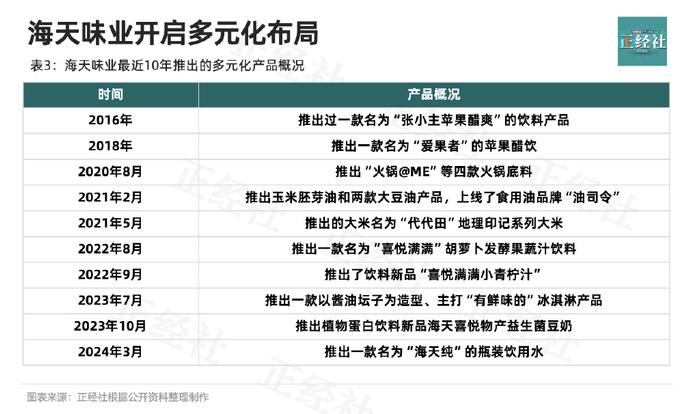 正经社分析师统计发现,海天味业在最近5年内相继推出20款左右的跨界新品,包括柠檬茶、冰淇淋、谷物坚果饮料、胡萝卜汁、青柠汁、苹果醋、大米等,构造了一个堪称庞大的产品矩阵(表3)。