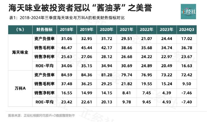 比较来看(表1),海天味业资产负债率一直不高,且连年降低直至17.02%,万科A则常年被债务困扰。万科A的销售净利润率、ROE从2018年的23.42%一路下滑,至2024年三季度已跌至负值-7.4%。海天味业同期内的销售净利率稳如老狗,ROE也常年稳坐20%的水准。