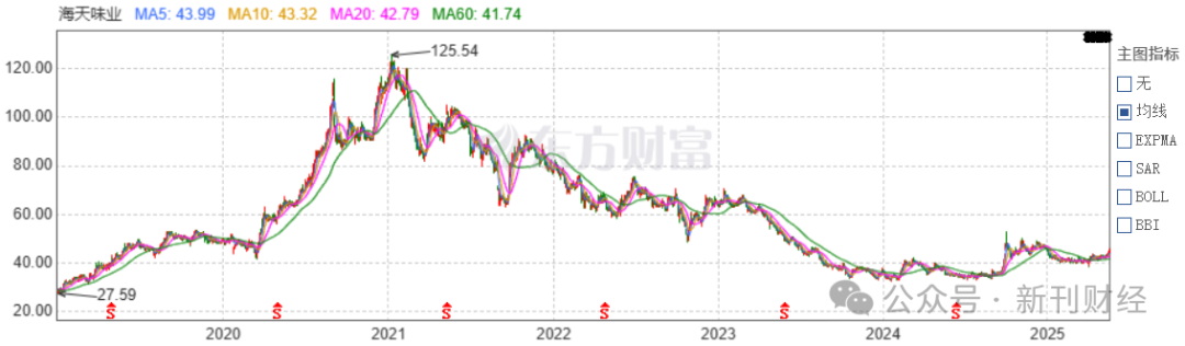 海天味业股价呈现明显的下滑特征,自2021年初创下125.54元的历史高点后持续下行,至2024年7月触及33.08元阶段低点,累计跌幅达73.65%。虽然此后股价有所反弹,但始终未能取得突破,目前维持在44元附近震荡。这种长期调整后的弱势反弹格局,或反映出市场对其增长前景仍持谨慎态度。