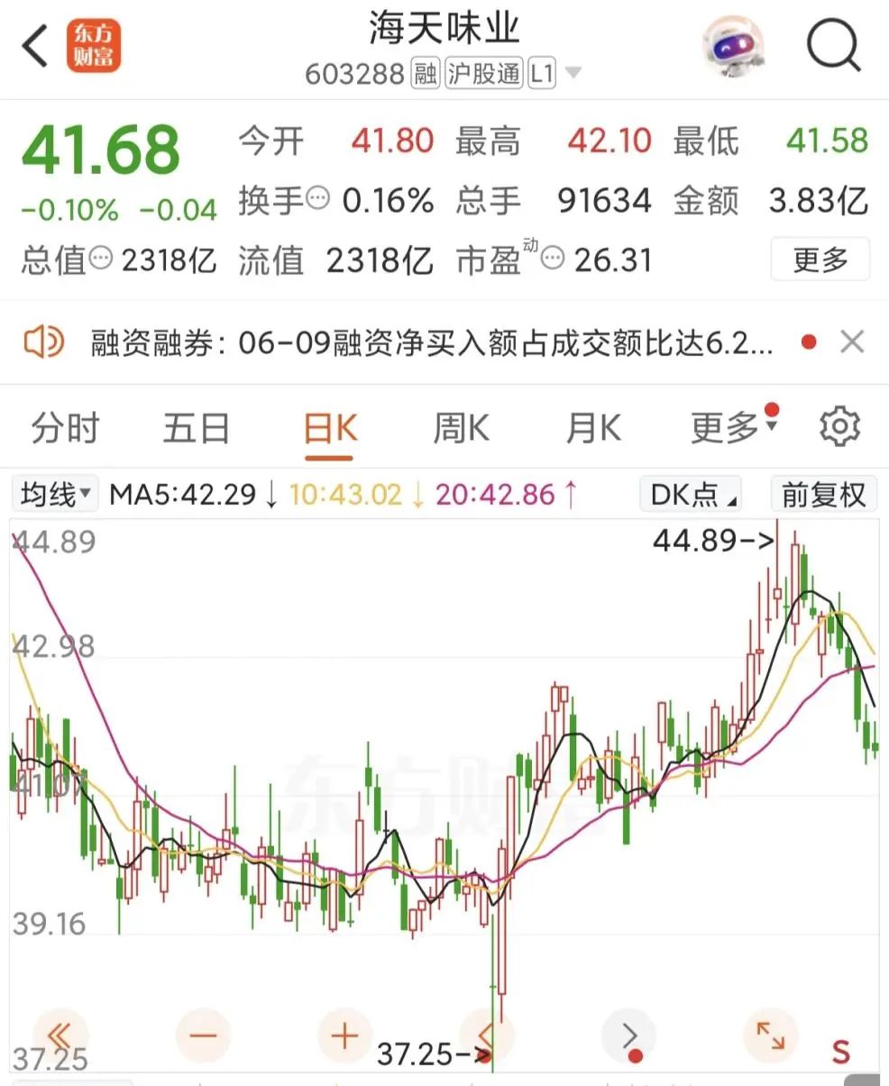 截至发稿,海天味业股价为41.68元/股,总市值为2318亿元。