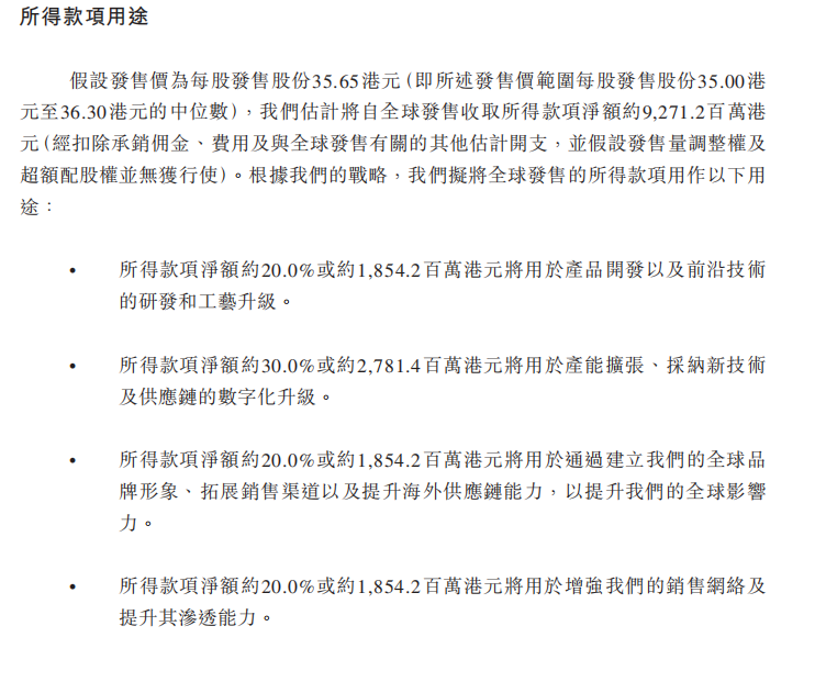 海天味业在公告中表示,本次募集资金将主要用于支持主营业务发展,重点投入产能扩建、技术研发、市场拓展及品牌建设等方面。其中,所得款项净额约20%将用于建立全球品牌形象、拓展销售渠道以及提升海外供应链能力,以提升海天味业的全球影响力。