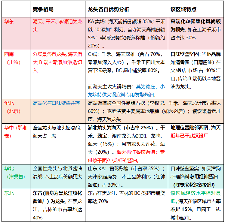 1)我们发现酱油在国内不同区域的竞争格局迥异,成因纷繁:既有口味壁垒的固守程度、经济发展的参差,亦关乎竞争对手渠道深耕的功夫。
