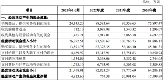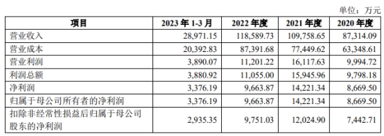 2020年-2022年及2023年1-3月,泰瑞机器营业收入分别为87,314.09万元、109,758.65万元、118,589.73万元、28,971.15万元,净利润/归属于母公司所有者的净利润分别为8,669.50万元、14,221.34万元、9,663.87万元、3,376.19万元,扣除非经常性损益后归属于母公司股东的净利润分别为7,442.71万元、12,024.90万元、9,751.03万元、2,935.35万元,经营活动产生的现金流量净额分别为17,599.99万元、20,991.04万元、767.38万元、4,813.60万元。