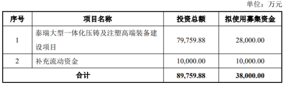 泰瑞机器昨晚披露的向不特定对象发行可转换公司债券预案显示,公司本次向不特定对象发行可转换公司债券拟募集资金不超过人民币38,000.00万元(含38,000.00万元),扣除发行费用后拟用于以下项目:泰瑞大型一体化压铸及注塑高端装备建设项目、补充流动资金。