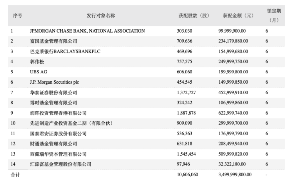 公告显示,此次发行价格为330元/股,向14名特定对象发行的股票数量为1060万股,发行募集总额为34.99亿元,扣除各项发行费用后,募集资金净额为34.76亿元。