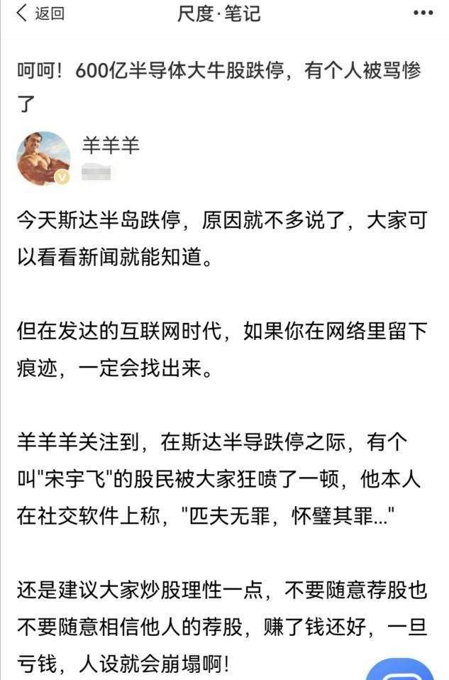 有意思的是,在尺度上,用户爆料称,在斯达半导跌停之际,有个叫"宋宇飞"的股民被大家狂喷了一顿(估计存在荐股情形荐股或者买了股票对外有所炫耀)。后来他本人在社交软件上称,"匹夫无罪,怀璧其罪..."。