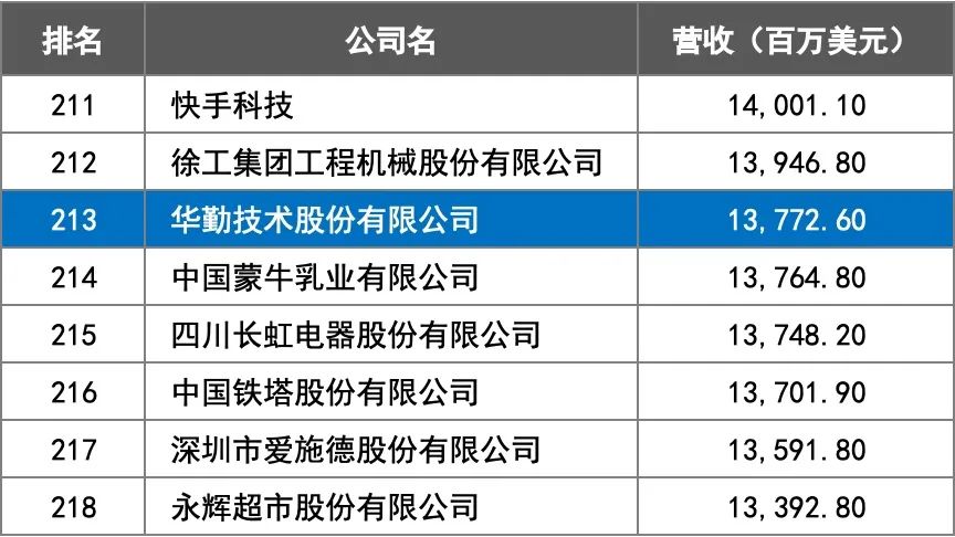 华勤技术凭借2022年度137.7亿美元的营业收入位列中国榜单第213位。面对复杂多变的环境,华勤全力推进“2+N+3”战略升级,构建更为完善的智能硬件平台,穿越行业周期,成功实现经营业绩的稳健增长。