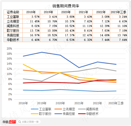毛利率最高的传音控股,期间费用率也高,长期在12%以上。