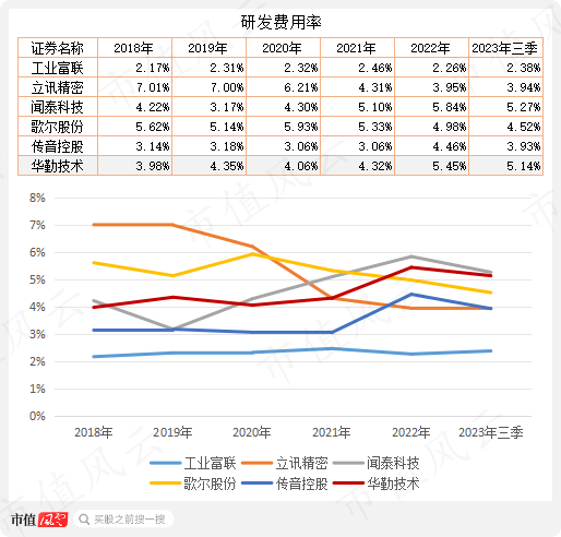 华勤技术还处于加速成长阶段,其研发费用率相对高些,2023年前三季度为5.1%,高于工业富联、立讯精密、传音控股、歌尔股份。